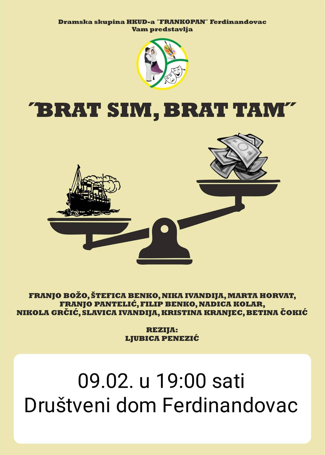 Predstava će se održati u subotu, 9. veljače 2019. U Društvenom domu Ferdinandovac, s početkom u 19,00 sati u izvedbi dramske skupine HKUD-a „Frankopan“ Ferdinandovac.